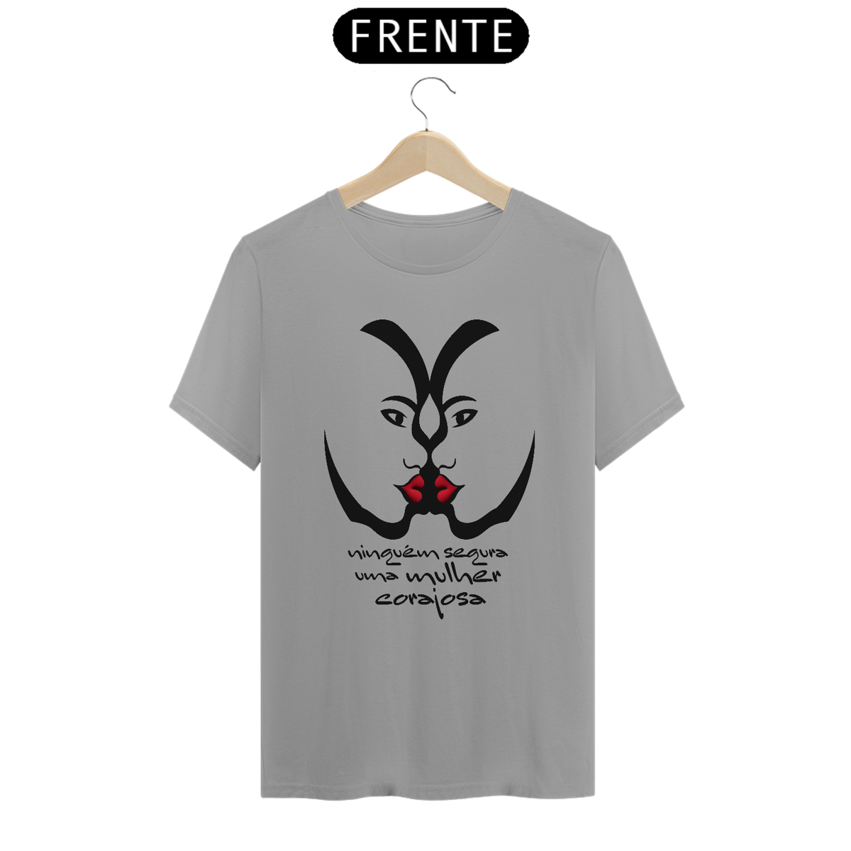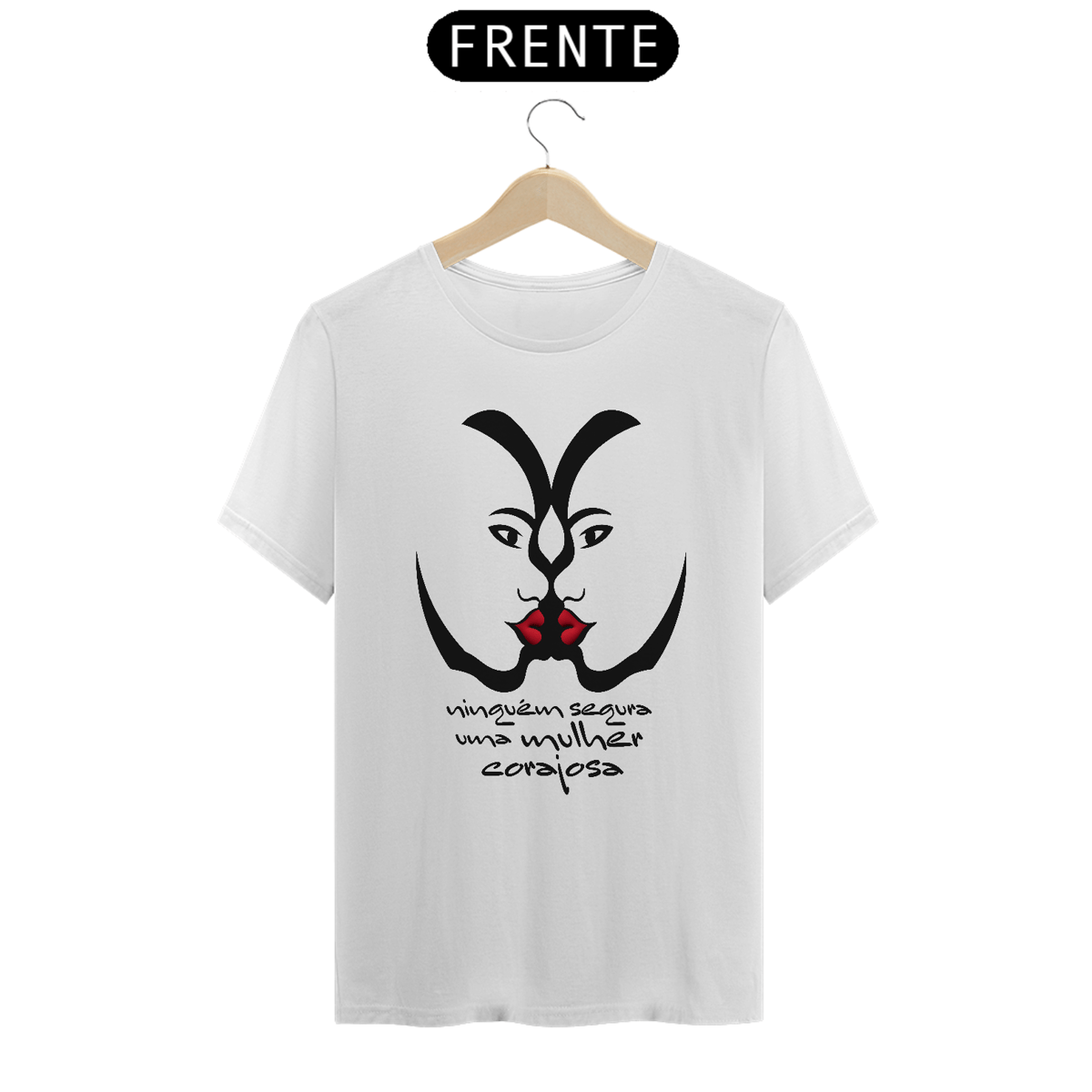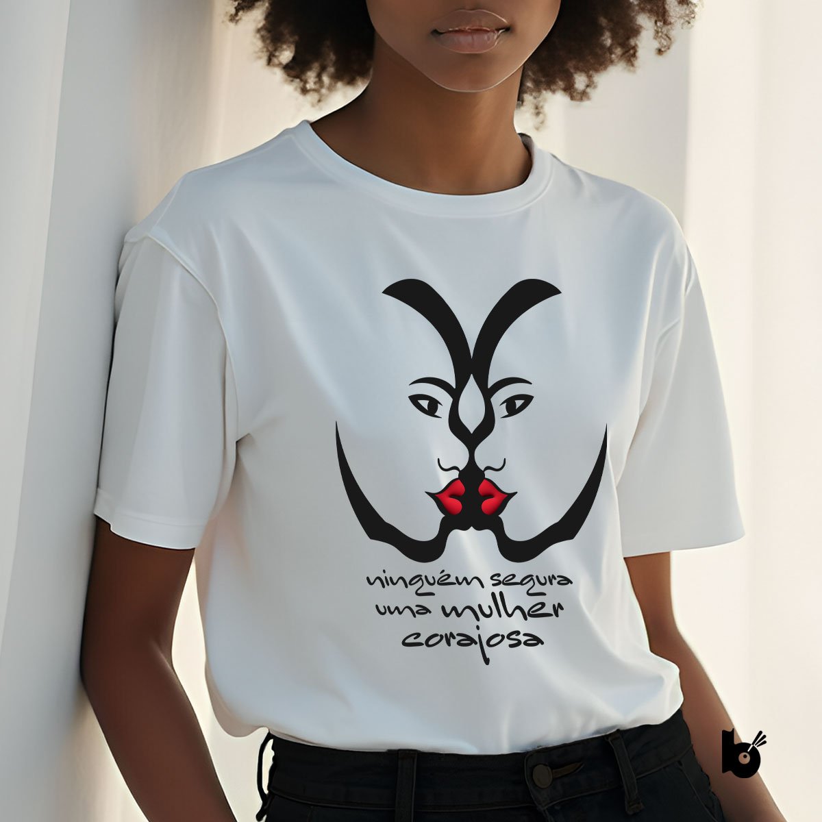Não há barreira que detenha de uma mulher corajosa. Com um design minimalista e impactante, nossa estampa exclusiva com duas faces refletidas desenhada à mão captura a essência das mulheres corajosas que desafiam as expectativas e superaram as limitações    mesmo quando as circunstâncias são adversas. A frase "Ninguém Segura uma Mulher Corajosa" reafirma a resistência e autonomia do empoderamento feminino.