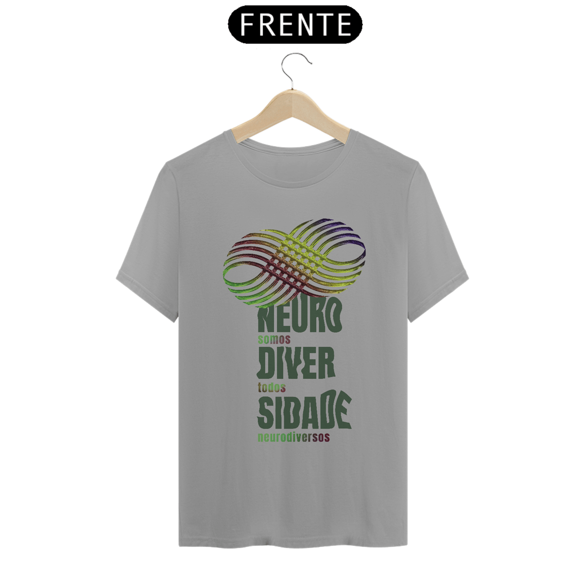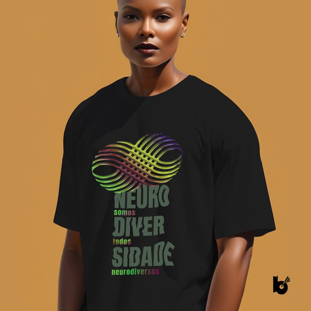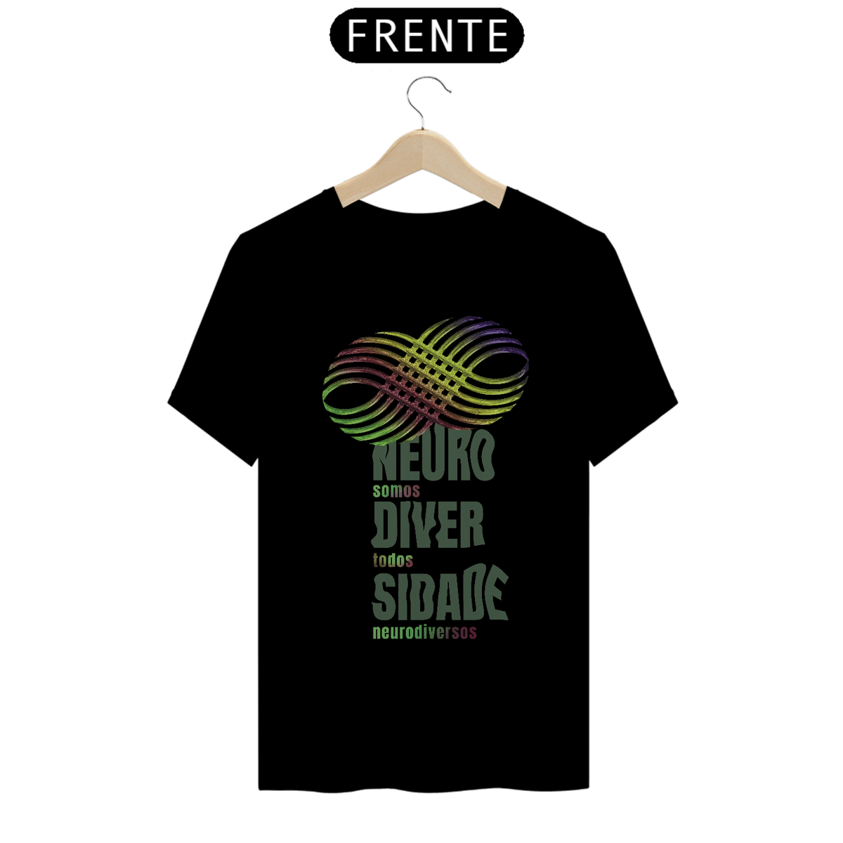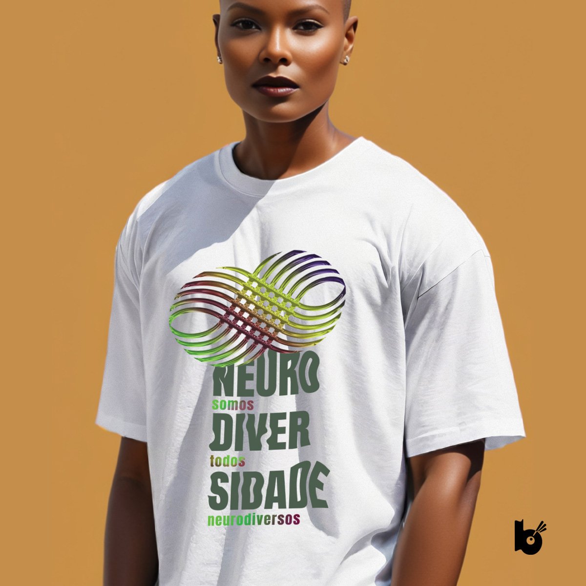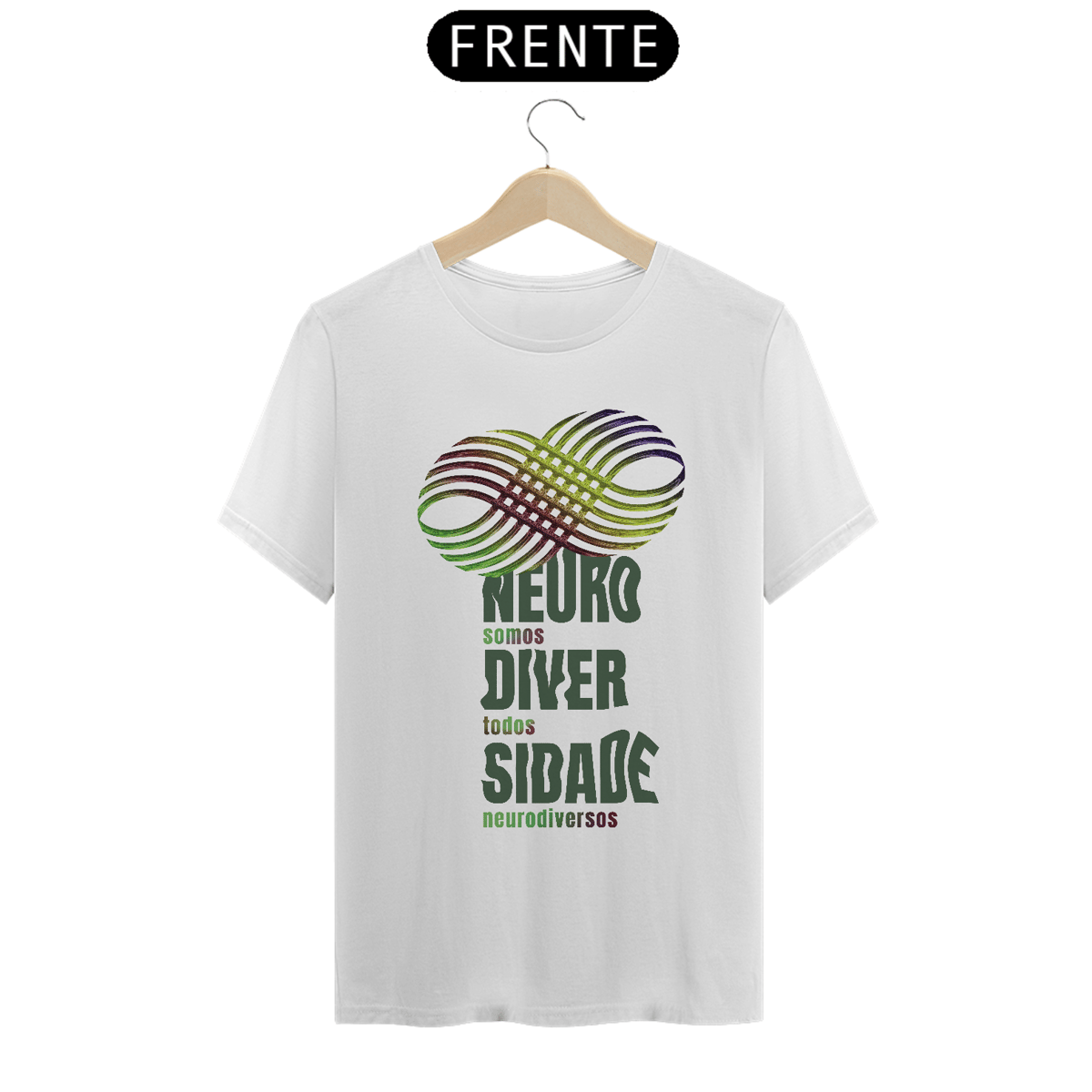 Camiseta  com símbolo estilizado da neurodiversidade e texto “Neurodiversidade – Somos todos neurodiversos”. Inspiração: “Nós somos todos habitantes neurodiversos do planeta, porque não há duas mentes neste mundo que possam ser exatamente iguais”(Judy Singer). Use ou presenteie os personalizados LELABIT com propósito.